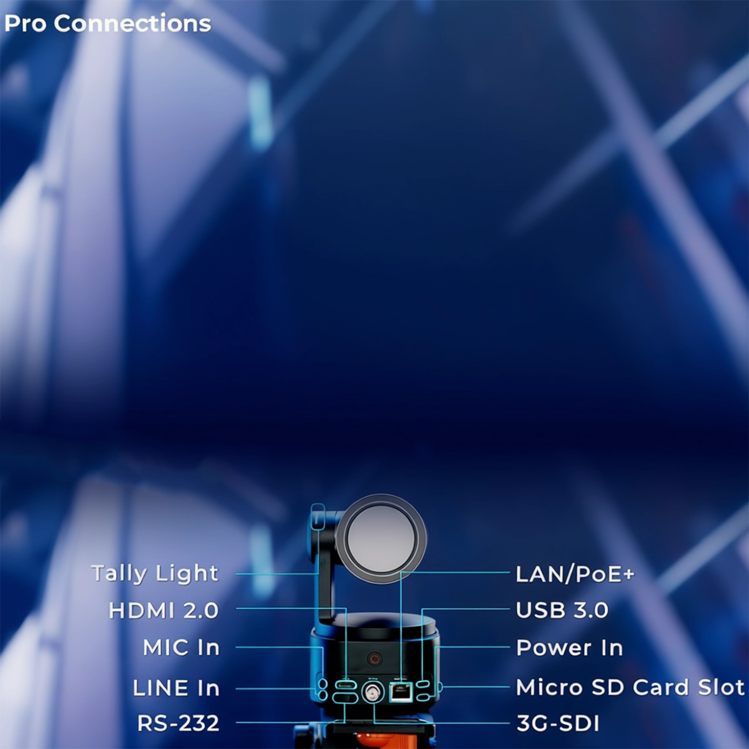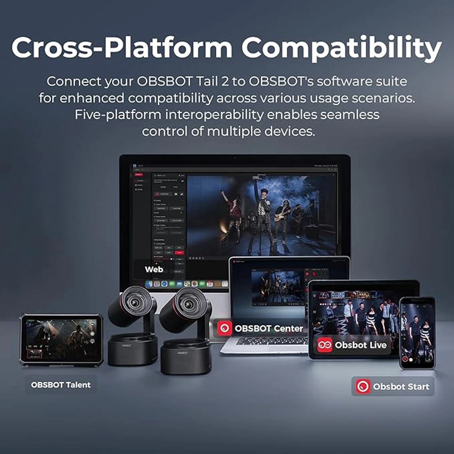 دوربین فیلم برداری اوبسبات OBSBOT Tail 2 به راحتی به سیستمهای موجود وصل میشود و چندین خروجی ویدئویی دارد HDMI)، SDI، USB-C و اترنت). از پروتکلهای SRT، RTMP، NDI، VISCA و Free-D پشتیبانی میکند. دوربین Tail 2 را میتوانید از پنج روش مدیریت کنید: اپلیکیشنهای PC و Mac، کنترل موبایل (شروع یا پخش زنده)، وبسایت مرورگر و پنلهای سختافزاری. چندین دوربین را میتوان همزمان همگامسازی کرد و با اپلیکیشن Talent بهصورت مرکزی همه دوربینها را نظارت کرد.
