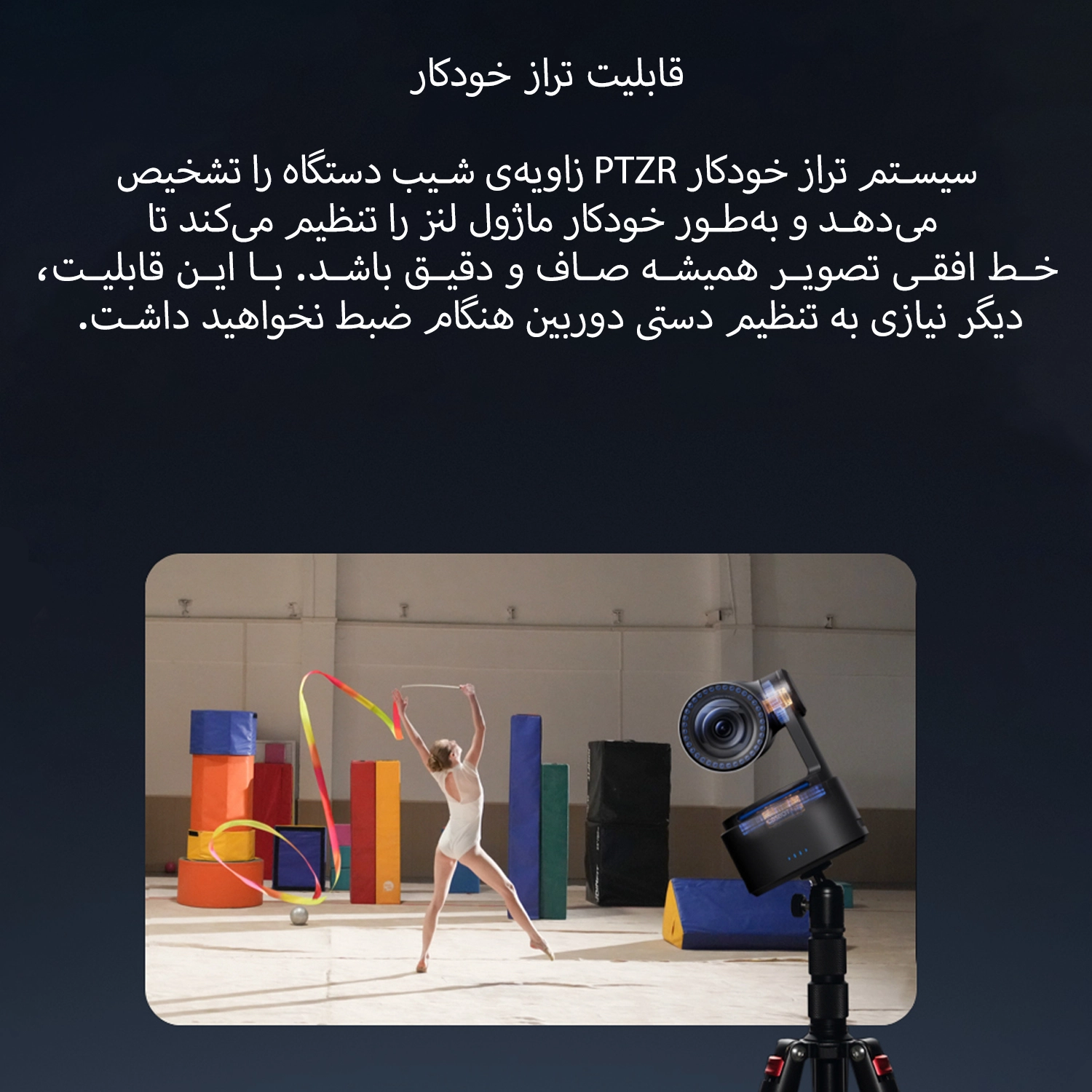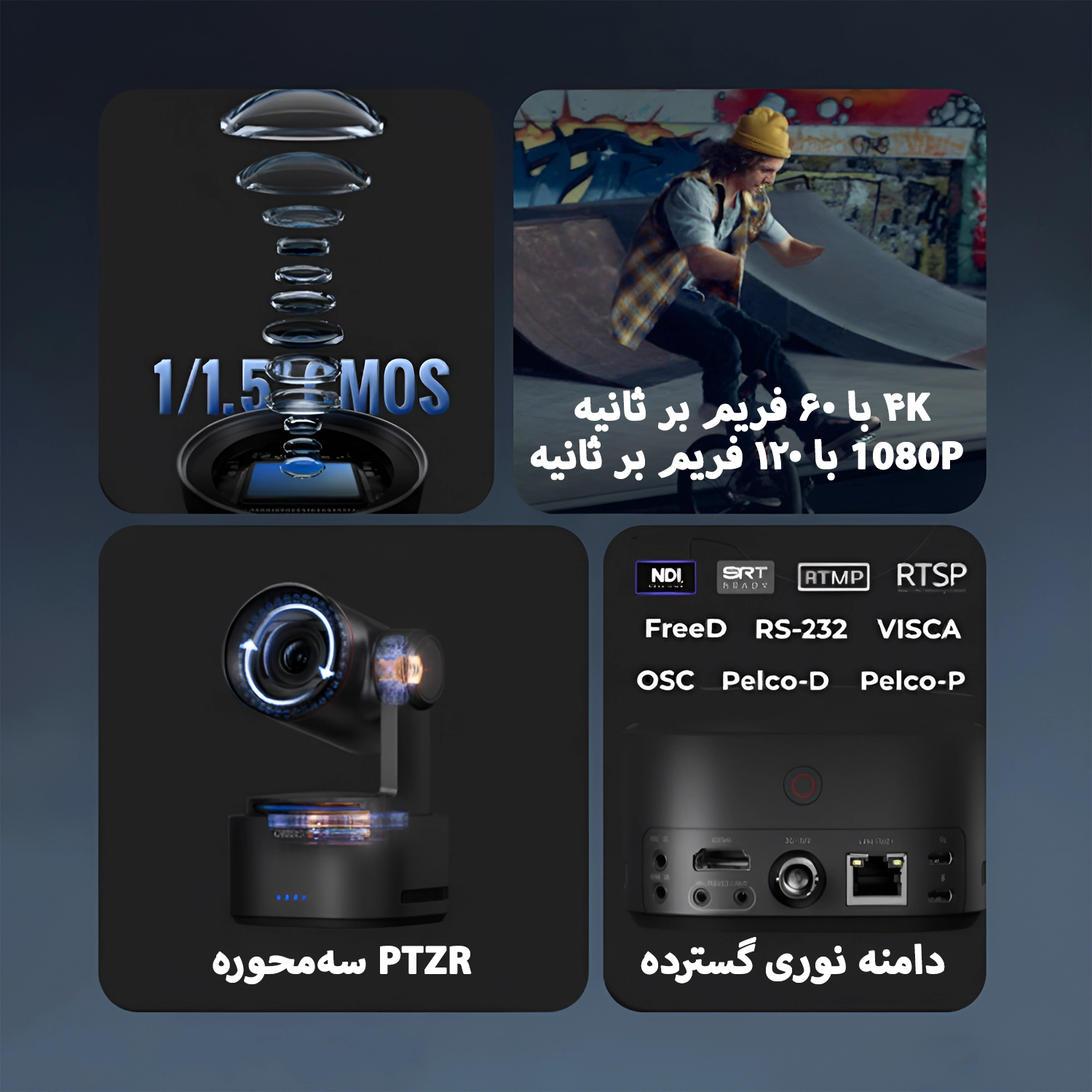 دوربین فیلم برداری اوبسبات OBSBOT Tail 2 نسل جدید PTZ با لنز چرخشی ۹۰ درجه است که تولید ویدئوهای لایو را بسیار راحتتر میکند. شما میتوانید بهسرعت بین حالت پرتره و افقی جابهجا شوید و در عین حال تصاویر با کیفیت 4k و نرخ ۶۰ فریم بر ثانیه بسیار واضح باقی میمانند. این دوربین دارای حسگر CMOS با اندازه ۱/۱.۵ اینچ است و با بزرگنمایی ترکیبی ۱۲ برابر، امکان ثبت نماهای نزدیک و صحنههای دور را با کیفیت حرفهای فراهم میکند.